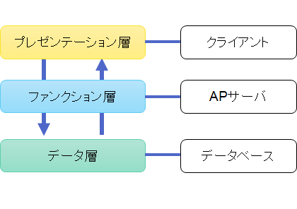 - アプリケーション層(ファンクション層/ロジック層): 業務ロジック(具体的な処理手順)を実装。クライアントからの要求に基づき、データの加工や変換、データベースへの指示などを行います。