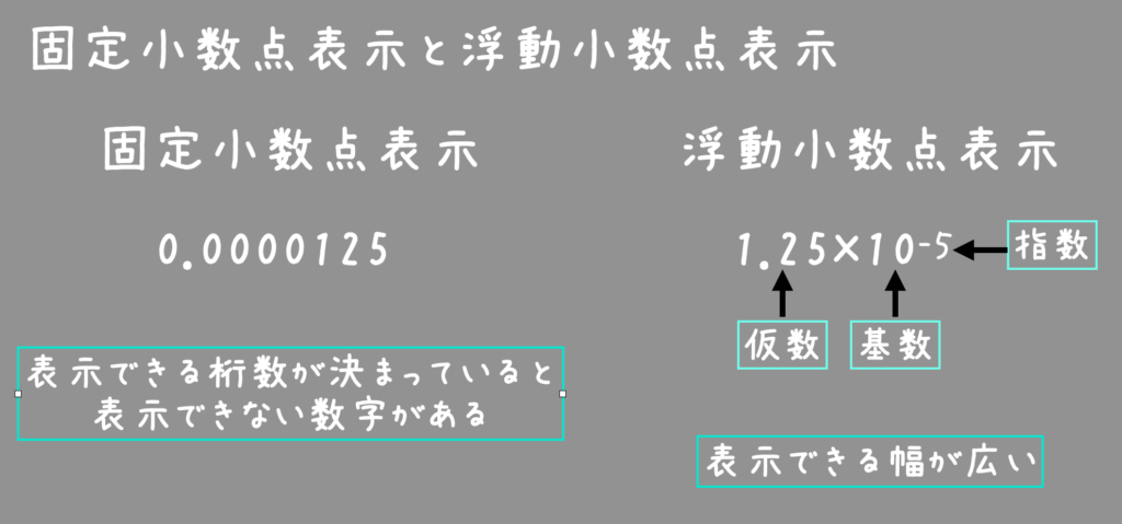 - 浮動小数点数 : 小数点の位置をずらして表現する方式。極端に大きい・小さい数を扱える。