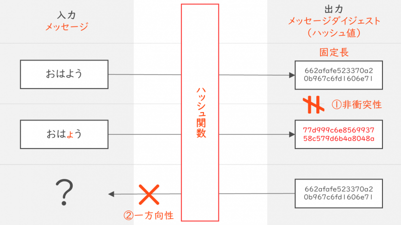 メッセージダイジェスト関数は、ハッシュ関数の一種です。また、一方向ハッシュ関数とも呼ばれ、任意の文字列から固定長の擬似乱数(ハッシュ値)を生成するアルゴリズムのことを指します。メッセージダイジェスト関数は、次のような特徴を持っています。