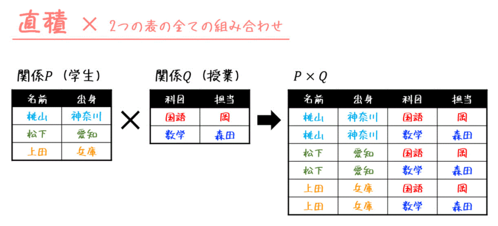 - 仕組み: 2つの表の「直積」から「選択」条件に合う行を抽出する処理と理解されます。
