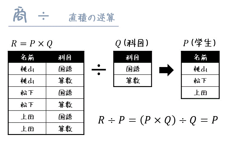 - 結果: R÷Q の結果は、Qに含まれる列(属性)が取り除かれ、Qとの組み合わせが成立した行の列のみが残る。