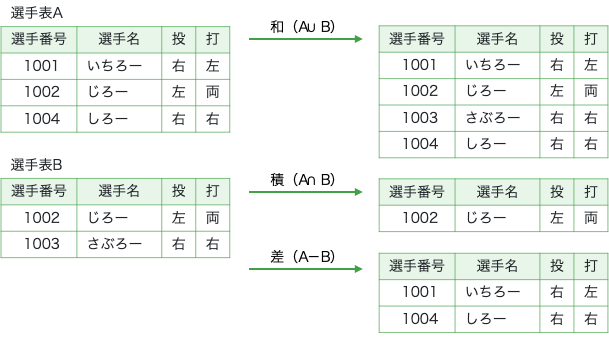 - 結果セット: 集合演算は結果を新しいテーブルとして返すが、通常は列名に第1テーブルのものが使用される。