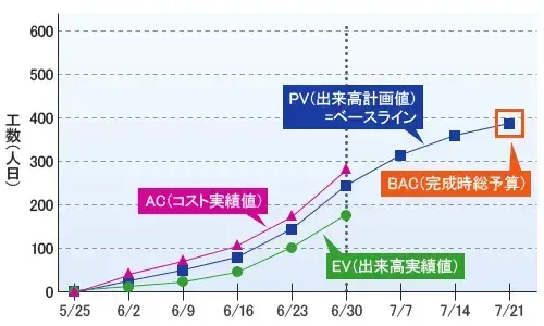 - EV (Earned Value / 出来高): 実際に完了した作業の価値(金銭換算)。