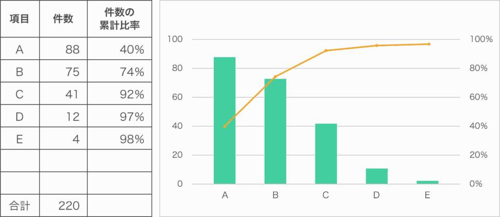 - 構造: 棒グラフ(降順)+折れ線グラフ(累積比率)