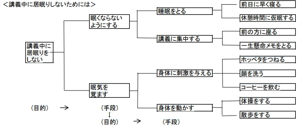 - 二次手段以降の展開: 一次手段を「目的」と見なし、それを達成するための手段をさらに展開する。