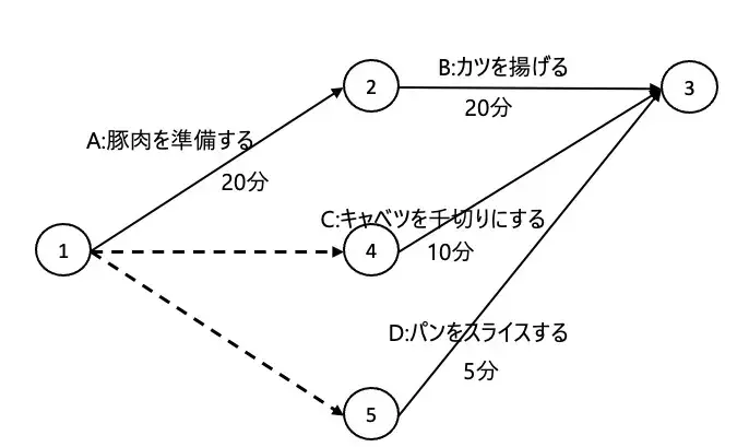- 構成要素: 実線(作業)、結合点(イベント)、点線(ダミー:依存関係のみの結合)。