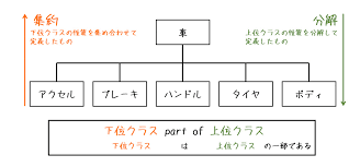 - 集約/分解(has-a): 部分と全体の関係(例: